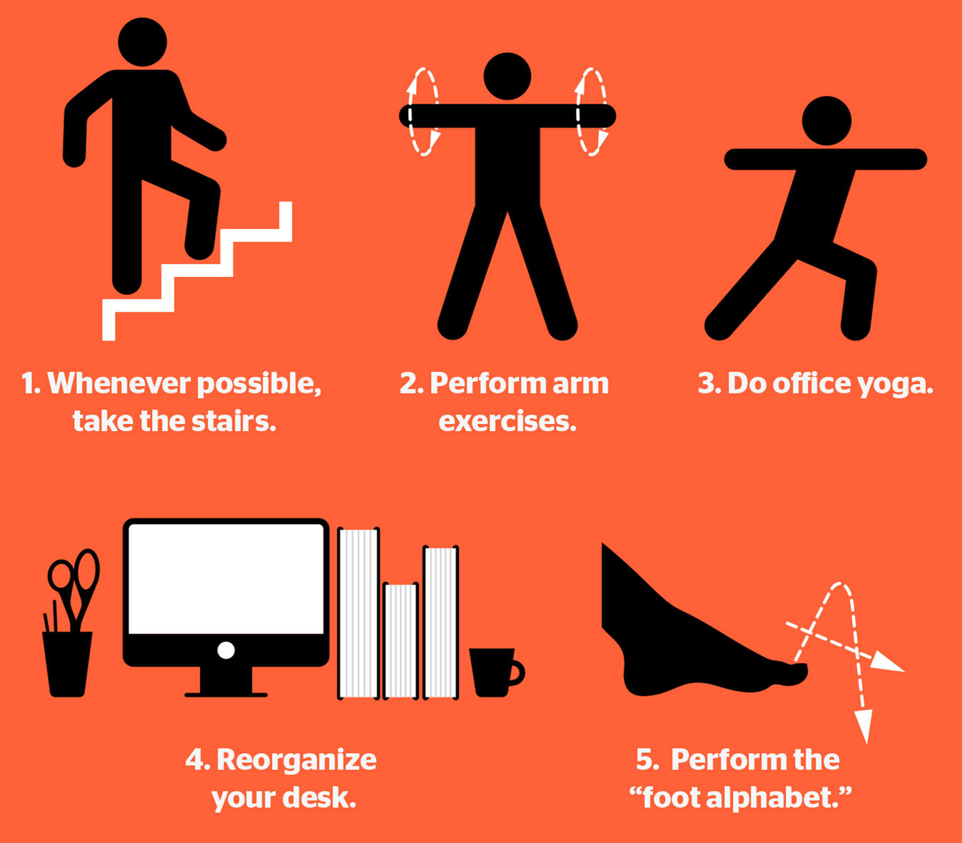 There are alternatives to the traditional desk layout which really can be good for your overall health. One simple adjustment is usually to replace your workplace chair having a stability ball-which can improve your posture and strengthen your abs. Another alternative will be to convert the office into a standing desk-this layout not simply provides for a new perspective, but also improves posture while focusing, reduces out of developing heart disease and will assist you to burn off fat and produce muscle. - Do the “foot alphabet.”